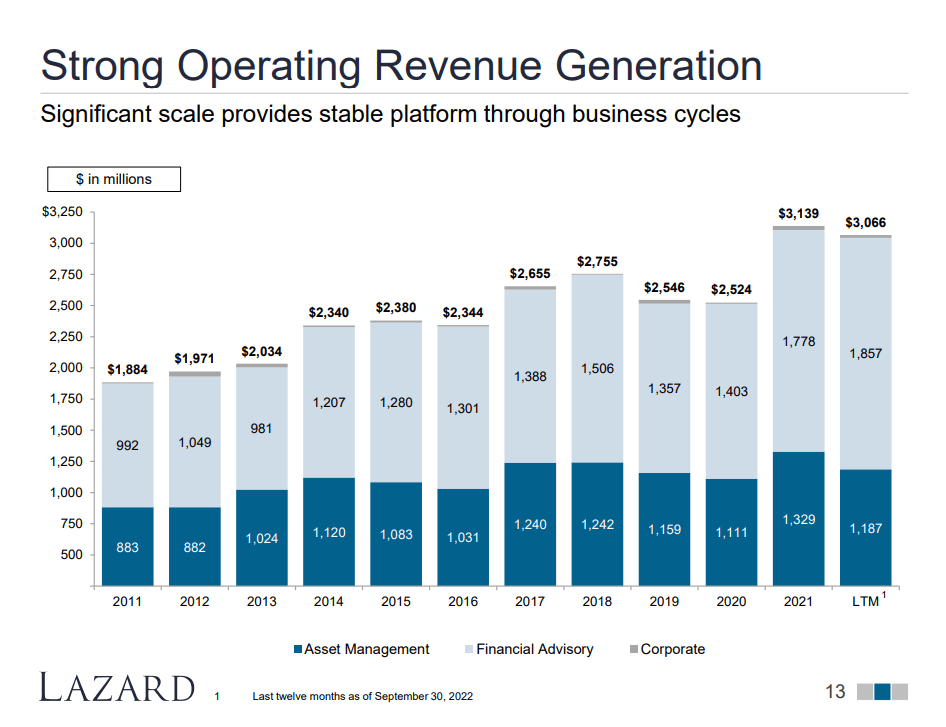 - Revenue increased a few points from the year before, comprehensive of pressures on the asset management business, which was by far the weaker of the two. Financial advisory grew almost 20% while asset management declined 15%. On an LTM basis, the asset management revenues are retreating to almost a COVID-19 level.