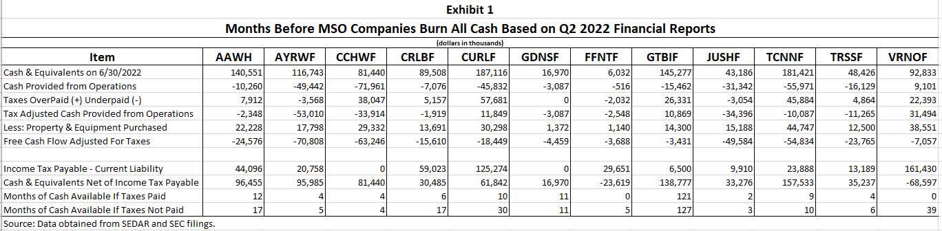 Line one (1) of Exhibit 1 shows the June 30, 2022 cash and cash equivalents position of each MSO. Line two (2) shows the cash provided from operations. Line three (3) shows current income taxes paid relative to the amount incurred in Q2. Line four (4) shows tax-adjusted cash provided from operations, which factors in the nonpayment and overpayment of income taxes incurred in Q2.