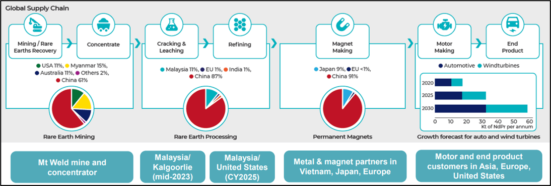 Capital investment in its Malaysia industrial complex will be a center-piece of the company’s strategy. Repurposing the ~10-year-old plant to enable it to process mixed rare earth carbonate feedstock (MREC) from its Kalgoorlie Rare Earths processing facility is underway.