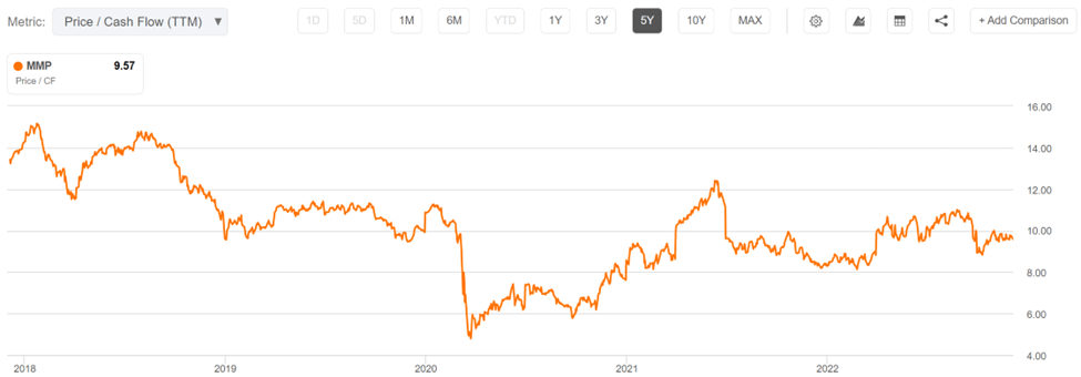 As shown below MMP has yet to recover to its pre-pandemic valuation range, despite oil prices having largely recovered. While most of MMP’s cash flows are not directly tied to commodity prices, the recovery in oil prices speaks to the overall financial health of the oil industry and MMP’s customer base. As such, I believe MMP deserves to trade at a price to cash flow of at least 11x, representing about a 15% upside from the current price.