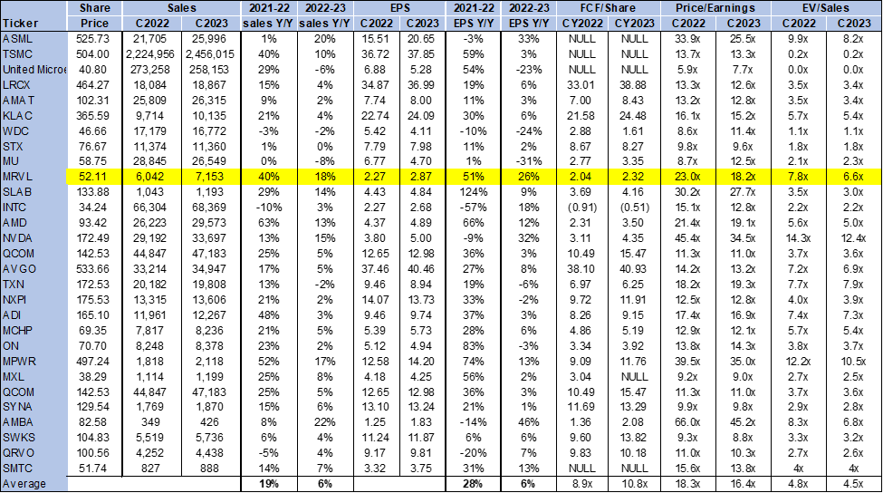 MRVL is trading at around $52. The stock is still relatively expensive, trading at 18.2x C2023 on the P/E basis EPS of $2.87 compared to the peer group average of 16.4x. On the EV/C2023 sales, MRVL is trading at around 6.6x compared to the group average of 4.5x.