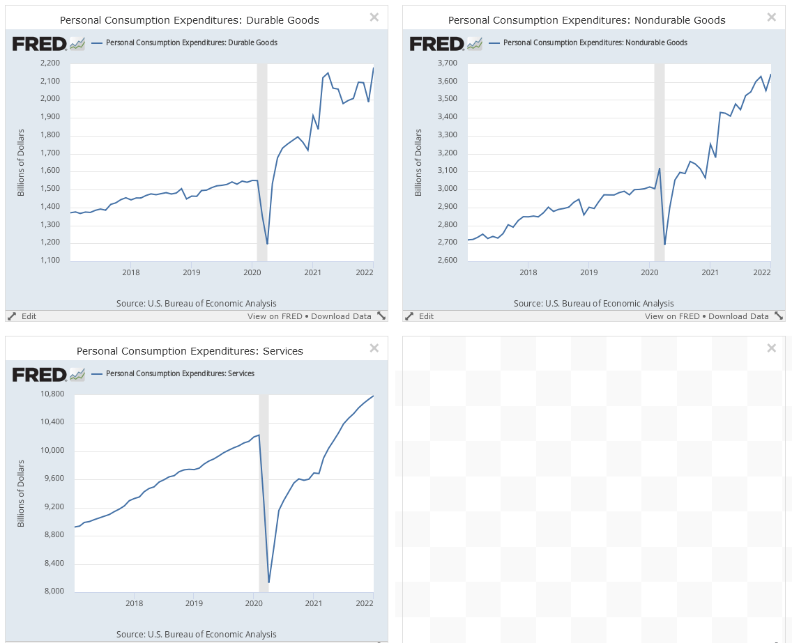 Personal consumption expenditures for durable (upper left) and non-durable goods (upper right) are at 5-year highs, as is spending on services.