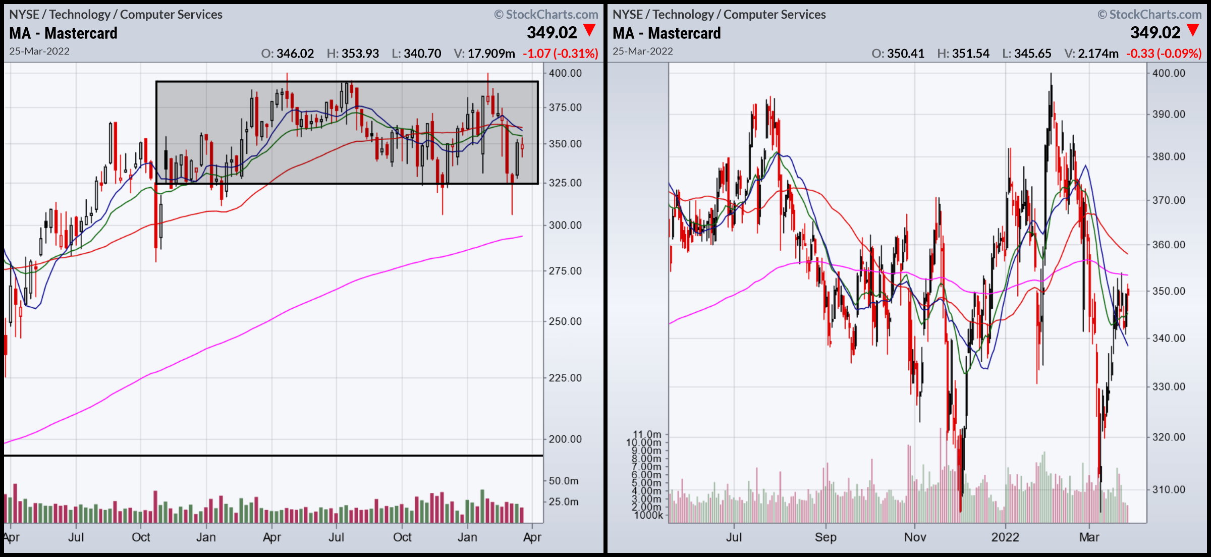 The left chart shows that MA has been trading between 325 and 400 for a year and a half. The right chart shows that the stock is currently trading right below the 200-day EMA.