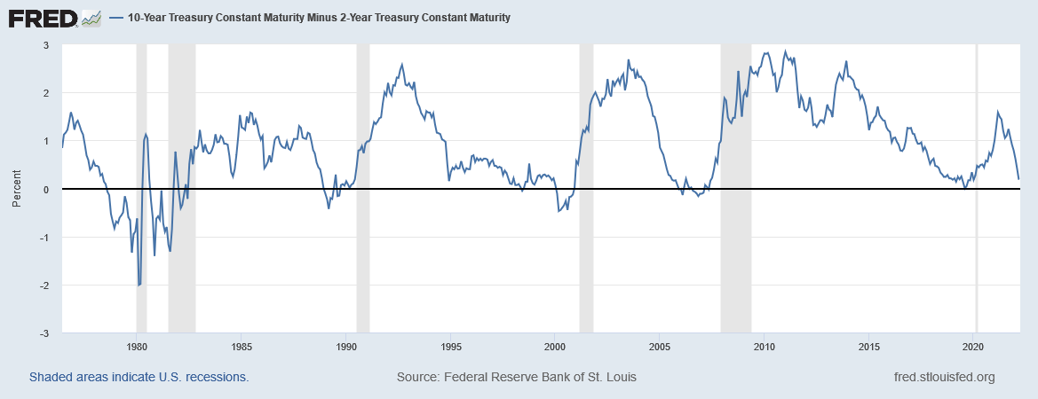 However, the Fed will be raising rates this year. And the 10-year-2-year spread is pointing towards a slowdown: