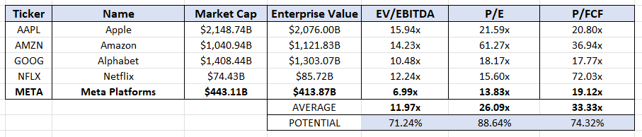 Attempting to approach the question of valuation when it comes to Meta is immensely difficult. As we have already discussed, the company is in a category of its own, almost finding itself as the king of the hill. However, as it is mostly recognized as a member of the FAANG group, historically its valuations were often compared to the rest of the stocks within the group. This is how Meta’s valuations look today when compared directly to other FAANG stocks.