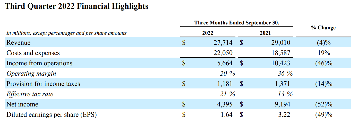 The great disappointment arguably was connected to the sharp loss of profitability, with net-income dropping by 52% versus the same period in 2021, falling to $4.4bn, or $1.64/share. Analysts had expected EPS of about $1.88.