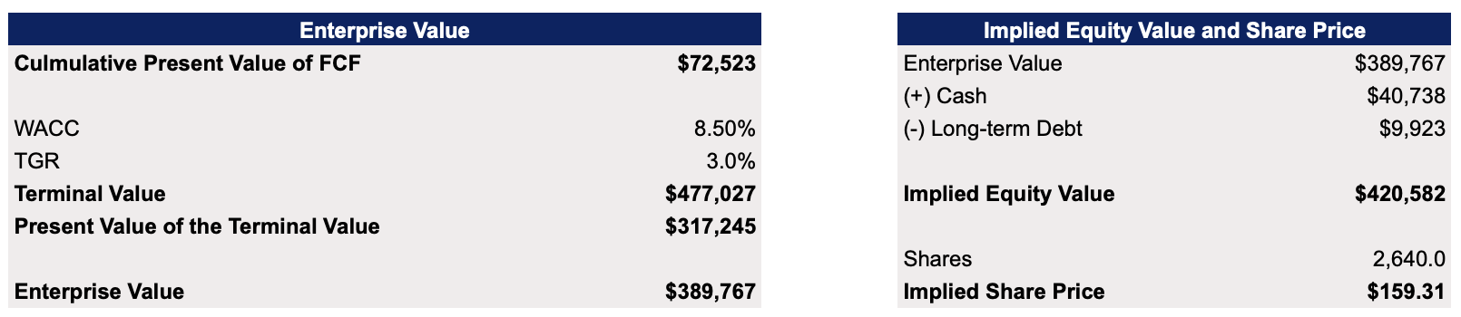 This model shows Meta’s enterprise value to be $390 billion while its fair value is $159.31 per share, below the current price of ~$190 per share.