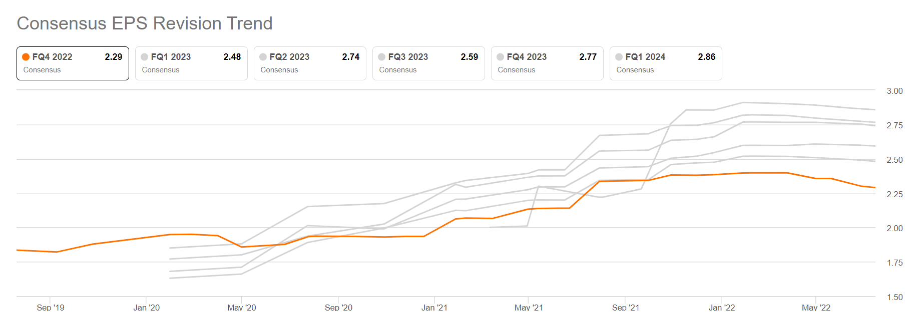 I would like to highlight that EPS expectations for Microsoft’s upcoming quarter flattened in 2022 and even started to decrease. While this takes some pressure off from the results, it also shows that Microsoft’s business is not immune to a worsening macro-environment and there is downside risk for the company’s financial performance.