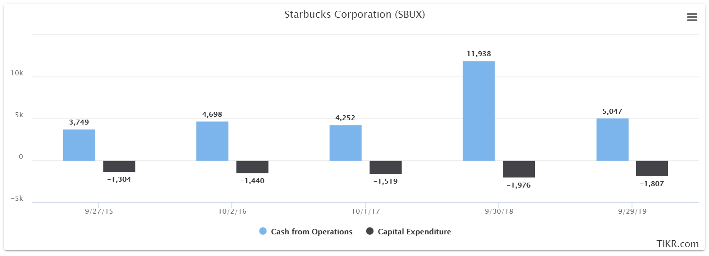 That’s really beside the point, however, as Starbucks has returned many billions of dollars to shareholders in the past two years than it has generated from free cash flow. The balance of the returns can be seen below.