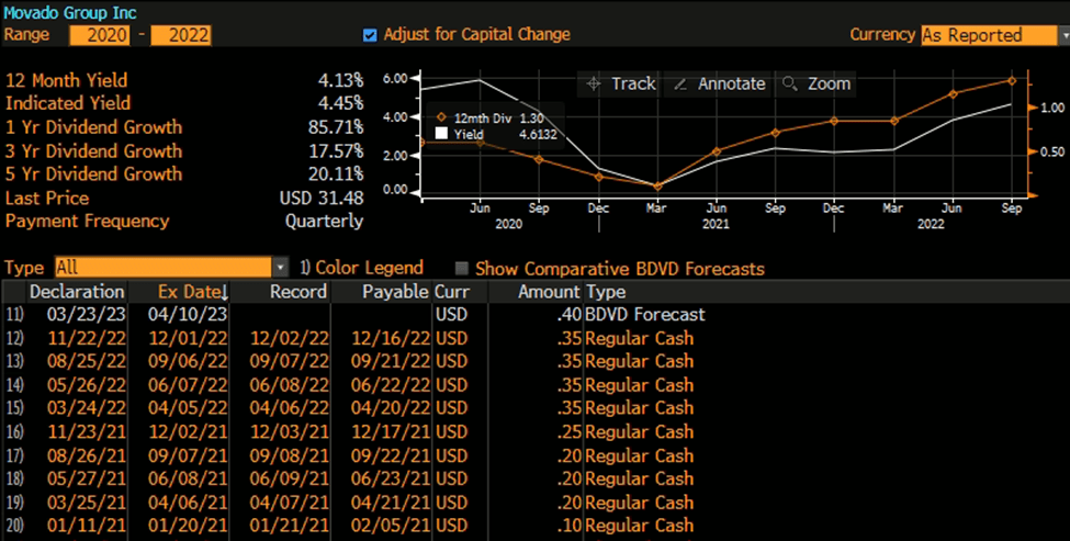 The company has paid a cash dividend of $0.35 [$1.40 annualized] for each share which gives Movado stock a yield of 4.5% and a payout of only 35% as compared to estimates for FY 01/2023. In our view, given the huge net cash position and strong FCF, MOV has much room to further increase the payout in the future.