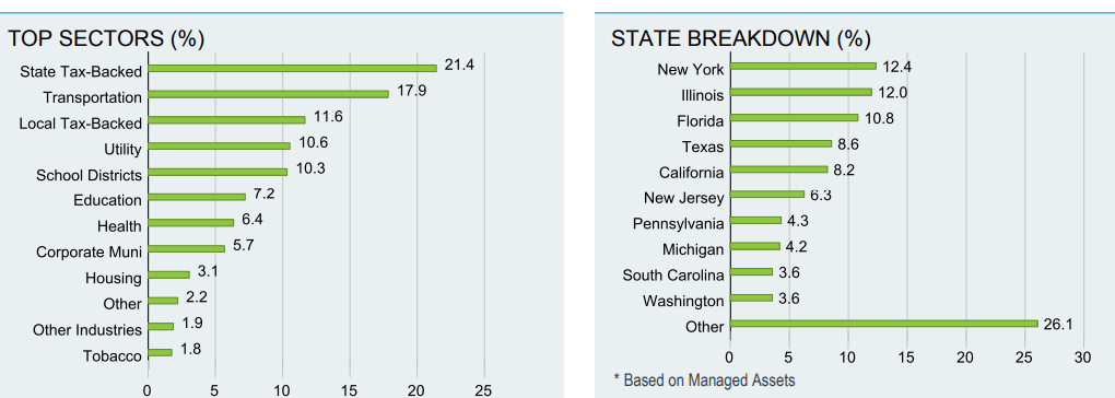 The following is the portfolio breakdown of the fund. It can be seen that the top 3 states with double-digit weights are New York, Illinois, and Florida. Texas and California follow closely with over 8% allocation each in the portfolio.
