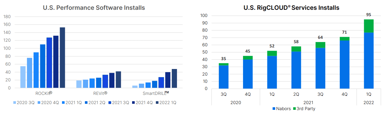 Nabors also offers Nabors Drilling Solutions, which help rigs to deliver best-in-class performance. Drilling Solutions added more than 2,100 USD per day per rig in the first quarter. 82% of Nabors’ Lower 48 rigs were in five or more NDS services, an increase of 8% versus the previous quarter and a record high penetration. Growth has been particularly strong in SmartDRILL, RigCLOUD and related analytics.
