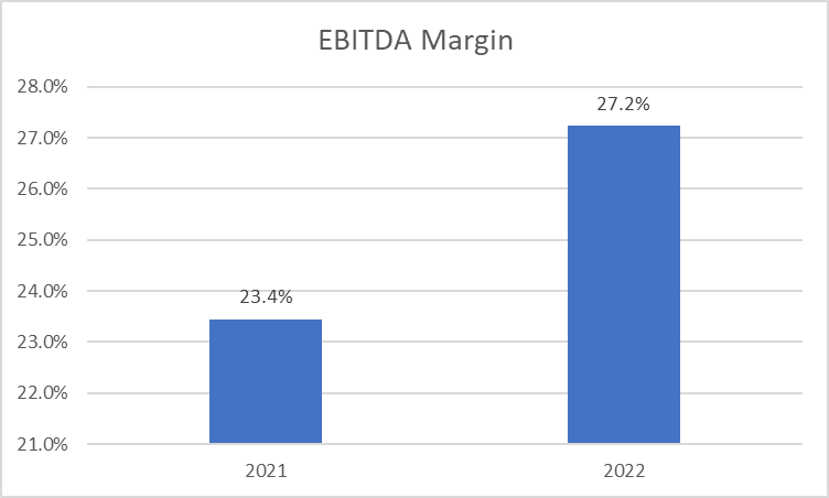 Overall, in the last three months compared to the same period a year prior, the company has successfully grown sales, outpaced costs, and increased its bottom line. EBITDA for the quarter grew more than 32%, resulting in an improvement in the EBTIDA margin from 23% in 2021 to 27% in 2022.