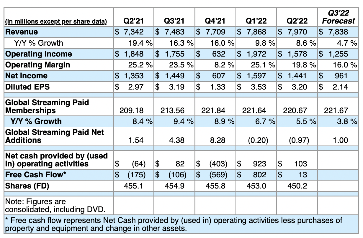 If there is one good thing besides not being hit as hard on the subscriber numbers as previously anticipated, it’s that the company is currently forecasting a return to growth on that front in the third quarter. At present, the company expects to add 1 million global streaming paid members to its platform, taking the size of its platform up to an all-time high of 221.67 million. With that, combined with increased pricing in recent months, revenue should come in at $7.84 billion. Although this 4.7% increase year over year compared to the $7.48 billion reported one year earlier is still below the $7.97 billion experienced in the second quarter, much of that has to do with foreign currency fluctuations. Instead of growing by 4.7%, management said that revenue would increase by 12% compared to the same time last year if we were ignoring foreign currency fluctuations.