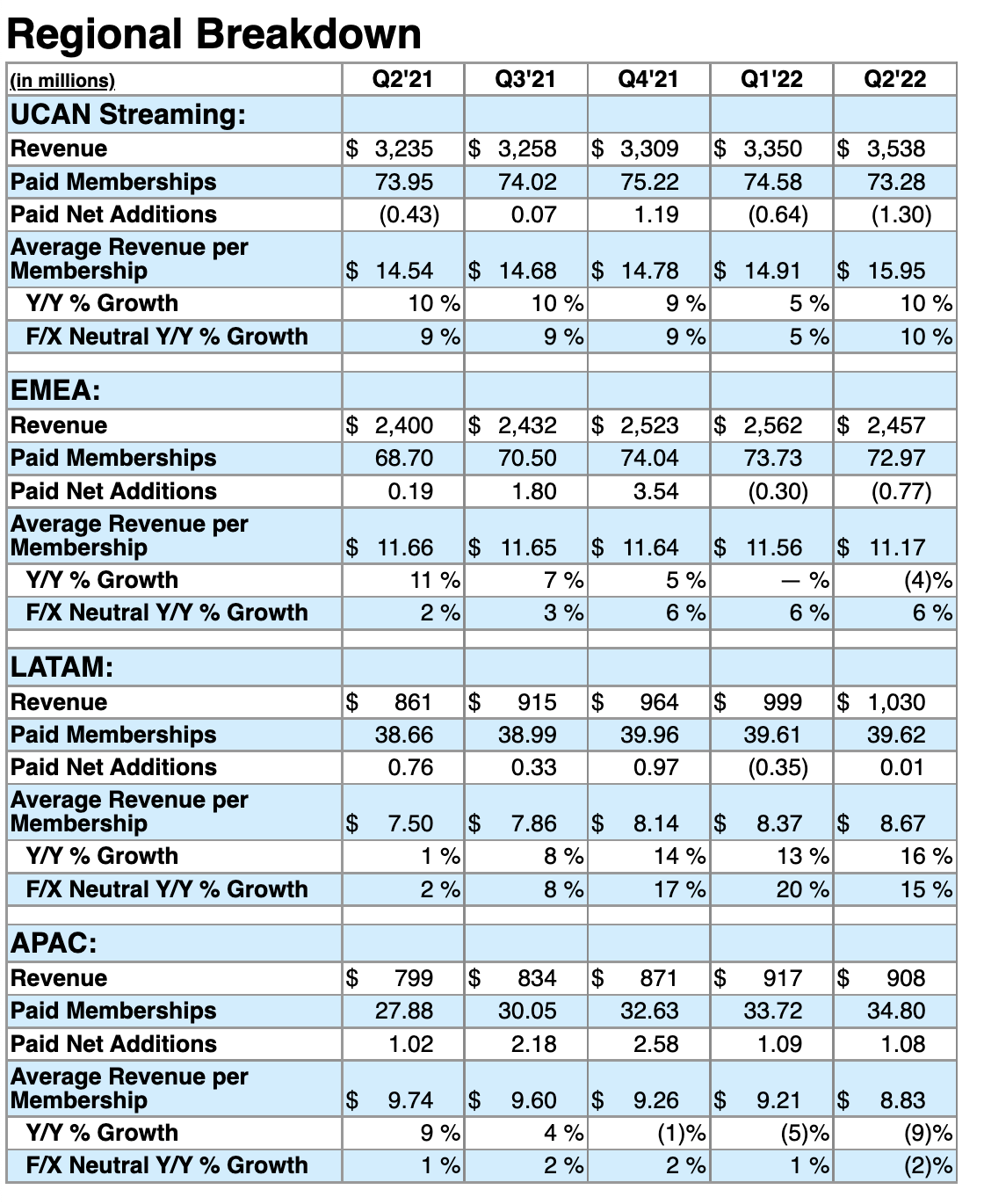 Fortunately for investors, the picture for the company did look better than what management anticipated. Instead of losing 2 million global streaming paid members, the company lost less than half that at 0.97 million. Though it is worth noting that not every paid member is equal for the business. In the UCAN market, which consists of the US and Canada, the company lost 1.30 million subscribers. On average, these members brought in $15.95 per month each in the latest quarter. The company also lost 0.77 million paid members under its EMEA (Europe, Middle East, and Africa) unit, an area responsible for roughly $11.17 per month in revenue per paid member. In the LATAM (Latin America) unit, where the company generates just $8.67 in revenue per paid member, it added just 0.01 million subscribers during the quarter. And in the APAC (Asia Pacific) region, where it added 1.08 million paid by members, it generated average revenue of just $8.83 per month. So in addition to seeing the number of paid members decline, the company also saw the pain take place in its most profitable markets and saw the good news come in its least profitable markets.