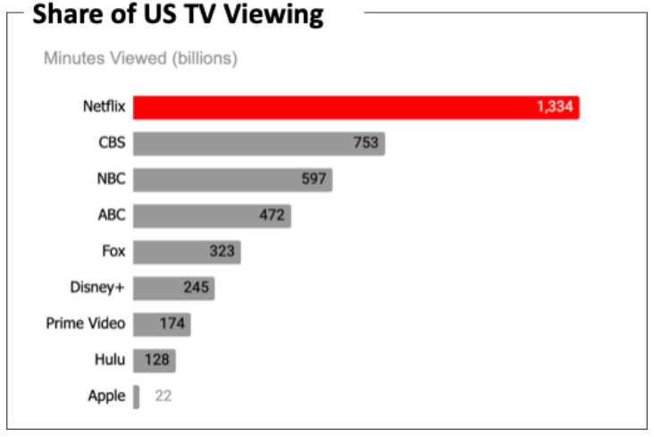 Although Netflix is experiencing stalled growth, its market share is still dominant. In the U.S. market, which is the most competitive market, during the 2021-2022 TV season Netflix ranked first in viewing time among broadcast networks.