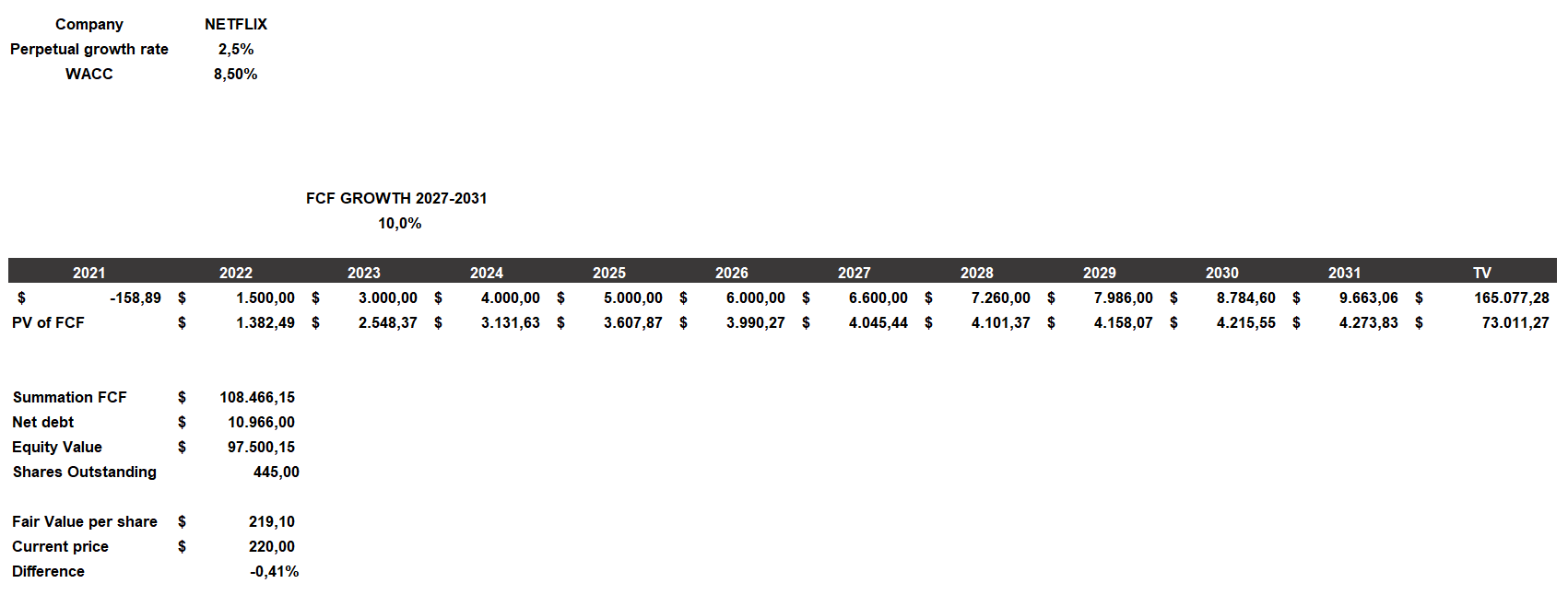 - Free cash flow was manually entered until 2026 and then increased by 10% each year. I considered a scenario in which the company finally begins to increase its free cash flow through the wider offering of Netflix original productions and in which it manages to monetize some of the 100 million non-paying accounts. Among other things, the company also expects free cash flow to increase greatly from 2022 onward.