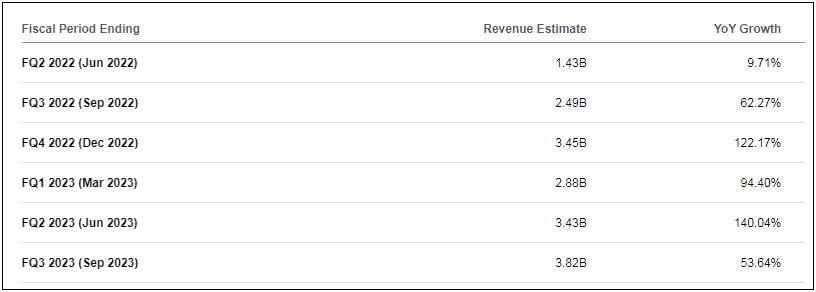 Again, I bring up the questions about near term production problems because expectations are calling for massive growth in the next couple of quarters. As you can see in the graphic below, starting with the current quarter, the street is expecting five straight quarters of more than 53% revenue growth, with three of those estimates being over 94%. On a sequential basis, analysts are calling for more than a billion dollars of revenue growth in Q3 of this year with nearly a billion more in Q4.