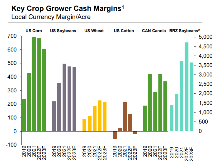In simple terms, if crop prices are high, farmers are incentivized to invest in fertilizers and seeds, to continue farming. And as you can see above, across the board, from corn to soybeans, crop prices are expected to remain elevated into 2023.
