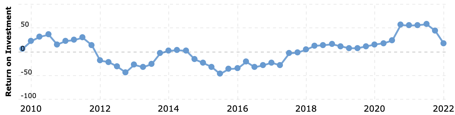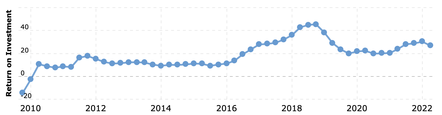 As further evidence of this, consider Nvidia’s positive and relatively stable ROI over the last decade: