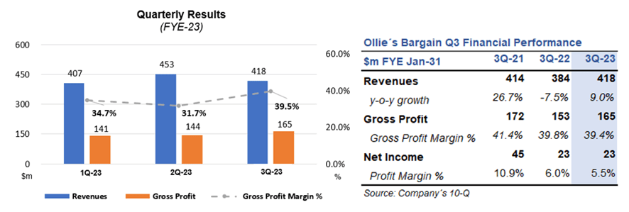 During the third quarter of fiscal year 2023, OLLI saw an increase in revenues of 9% from $384 million during the same quarter last year to $418 million. The first positive news was that during the third quarter, the company saw its gross margin increase to 39.5%. This is a nice improvement, as during the previous quarter OLLI had delivered one of its worst quarters regarding gross profit margin at 31.7% (see graph below).
