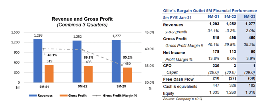 Looking at the bigger picture, results were disappointing, nonetheless, OLLI remains profitable and with substantial liquidity. We can expect the gross profit margin target of 40% to be missed for FY23, however, it seems like the worst has passed with supply chain costs and inflation easing. Management has signaled tighter cost controls, which combined with lower supply chain costs could produce the necessary costs easing for OLLI to return to higher profitability and extensive free cash flows.