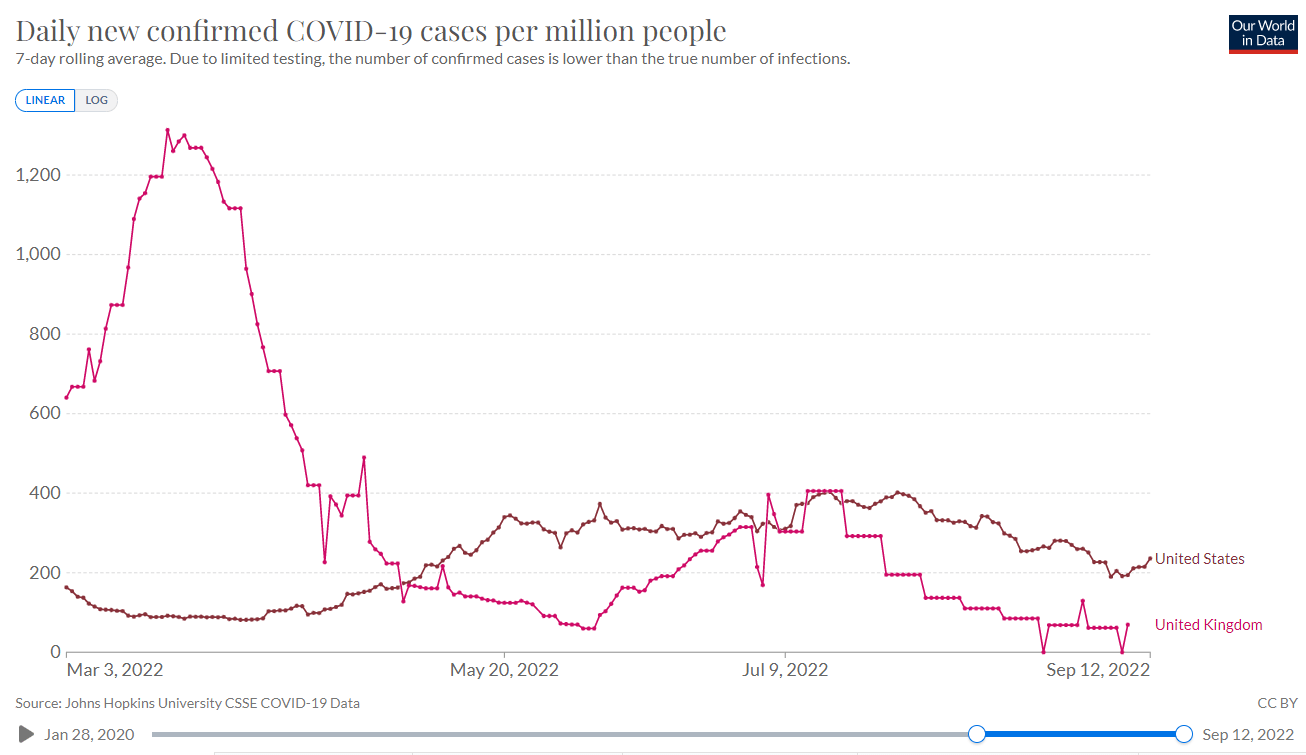COVID cases in the US and UK (7-Day rolling) (OWID)