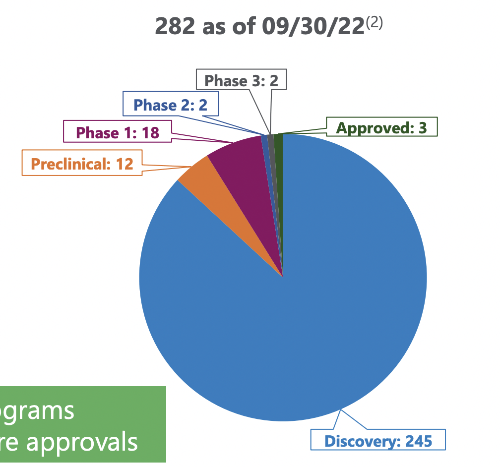 Slide 15 describes how its collection of partner therapies in various phase of development have grown from an aggregate of 16 in 2016 to 282 as of close of Q3, 2022. In 2016 it had but a single program that had advanced to a preclinical stage; all the rest were discovery programs. Its situation has advanced to 282 programs as shown in the excerpt below: