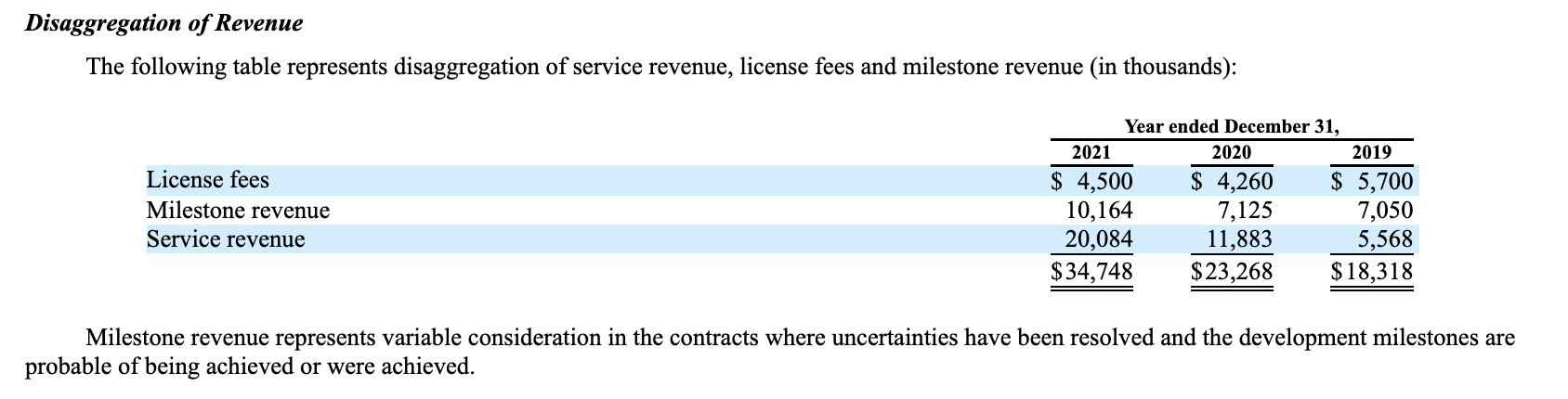 …typically derived from our license agreements with our partners and consists of: (i) upfront or annual payments for technology access (license revenue) and payments for performance of research services; (service revenue); (ii) downstream payments in the form of preclinical, intellectual property, clinical, regulatory, and commercial milestones (milestone revenue) and (iii) royalties on net sales from our partners’ product sales, if any.