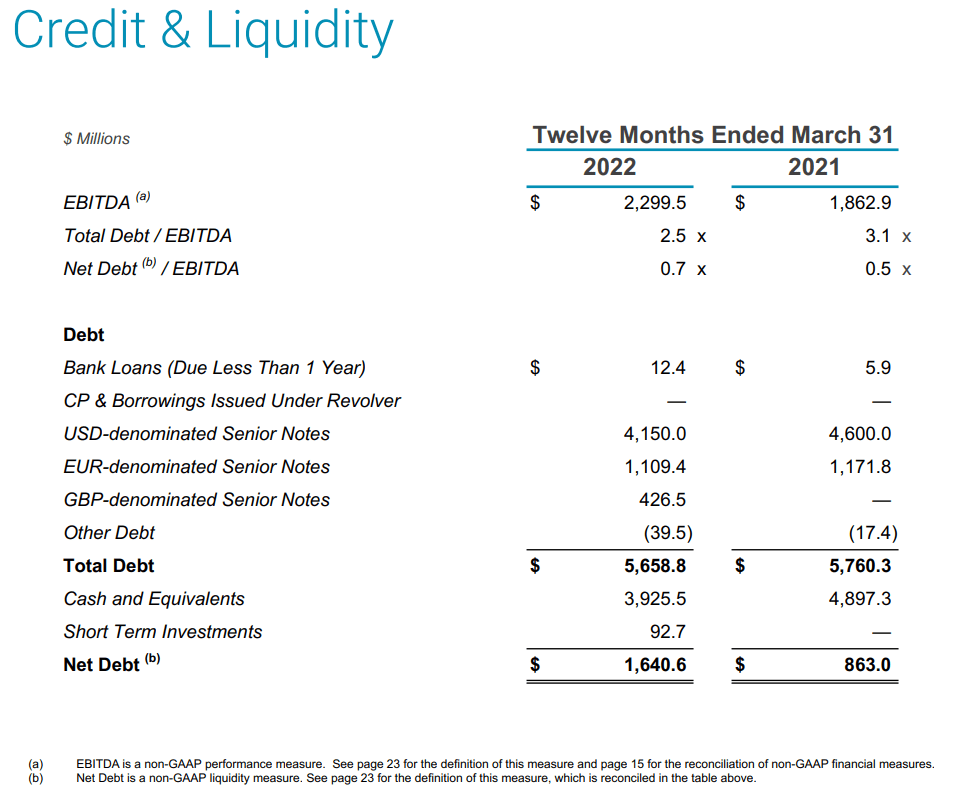 Once the cash and short-term investments are net out, net debt to EBITDA is only ~0.7x, which is slightly higher than the ~0.5x it was a year ago, but still a very safe amount of leverage.