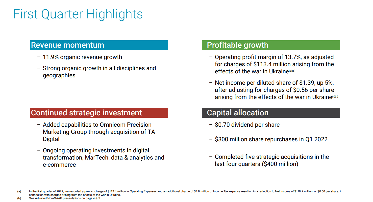 For Q1 Omnicom delivered solid results, with 11.9% organic revenue growth and $300 million in share repurchases during the quarter. Net income per diluted share was $1.39 after adjusting for charges of $0.56 per share that resulted from the war in Ukraine.