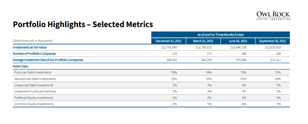 In the third quarter, high quality first and second liens accounted for 86% of the BDC’s investments. Other investments included unsecured debt, funds/investment vehicles, and equity, accounting for 14% of Owl Rock’s total investments.