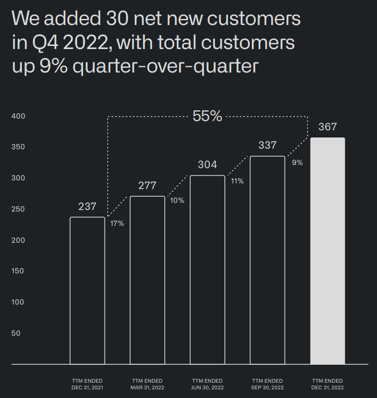 Palantir generated 18% top line growth in Q4’22, driving by the government segment, and reported total revenues of $509M. In third-quarter, Palantir grew its revenues at a 22% rate so the firm unfortunately saw a quarter over quarter revenue deceleration. The government segment grew revenues 23% year over year to $293M while the commercial segment saw its revenues go up by 11% year over year to $215M. The commercial segment saw its third straight quarter of revenue deceleration in FY 2022 which is having an impact on Palantir’s growth projections for the current fiscal year, but the company continued to do very well regarding customer acquisition.
