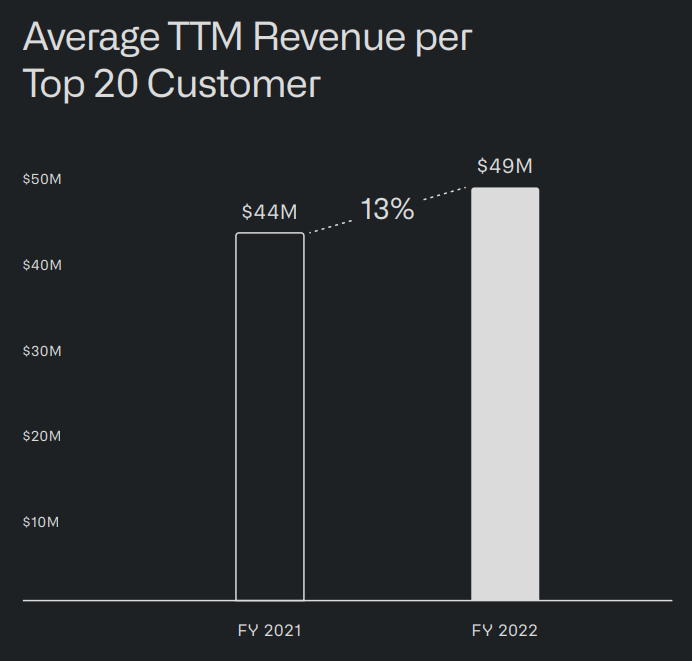 Additionally, Palantir keeps making progress by upselling its customers. The average top 20 customer spent $49M on Palantir’s products and services in the last twelve months, showing an increase of 13% year over year. With improving customer monetization, top customers become more valuable and continue to make an outsized revenue contribution for Palantir.