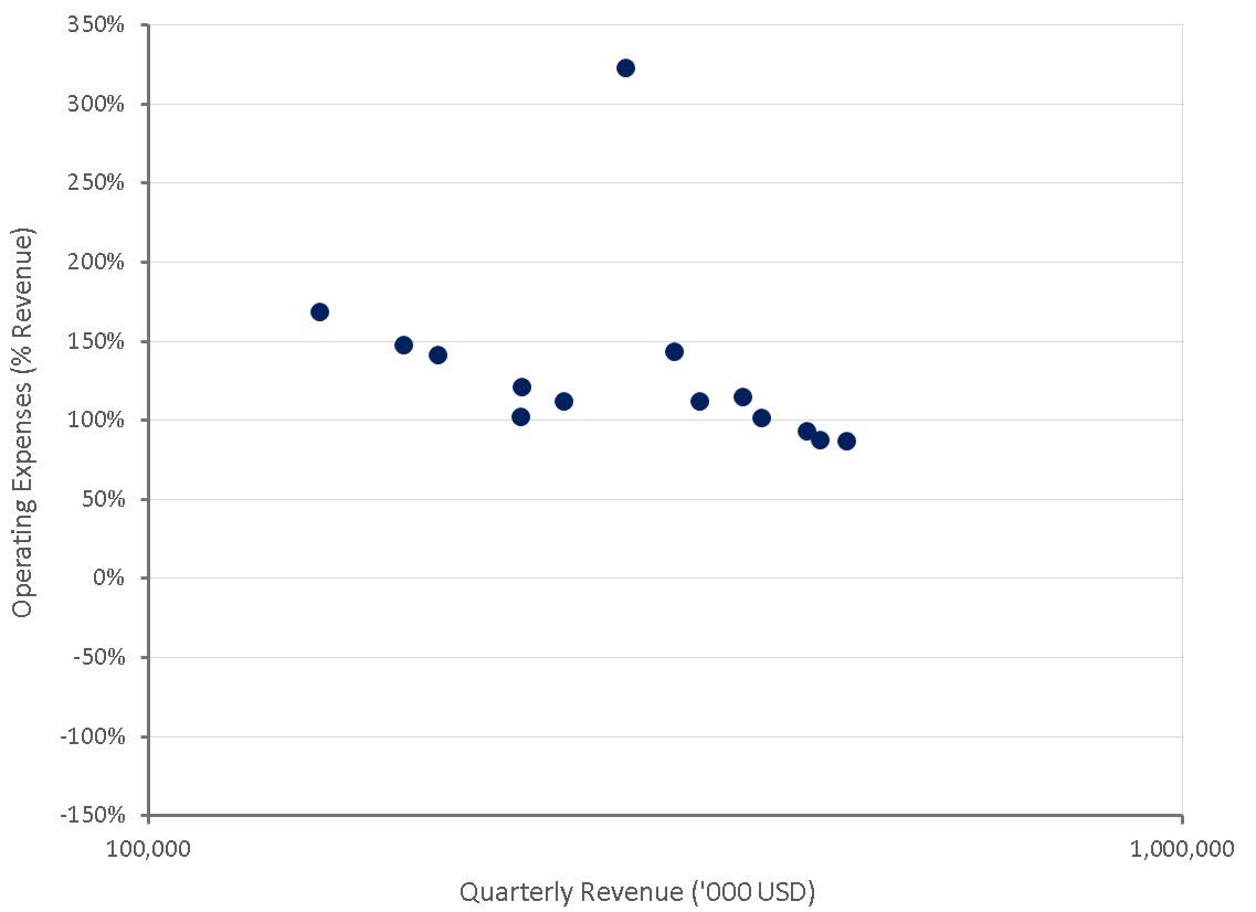 Figure 9: Palantir Operating Expenses (source: Created by author using data from Palantir) Figure 10: Palantir Operating Leverage (source: Created by author using data from Palantir)