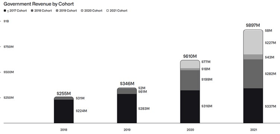 Figure 5: Average Revenue of Top 20 Palantir Customers (source: Created by author using data from Palantir) Figure 6: Palantir US Commercial Revenue by Cohort (source: Palantir) Figure 7: Palantir Government Revenue by Cohort (source: Palantir)