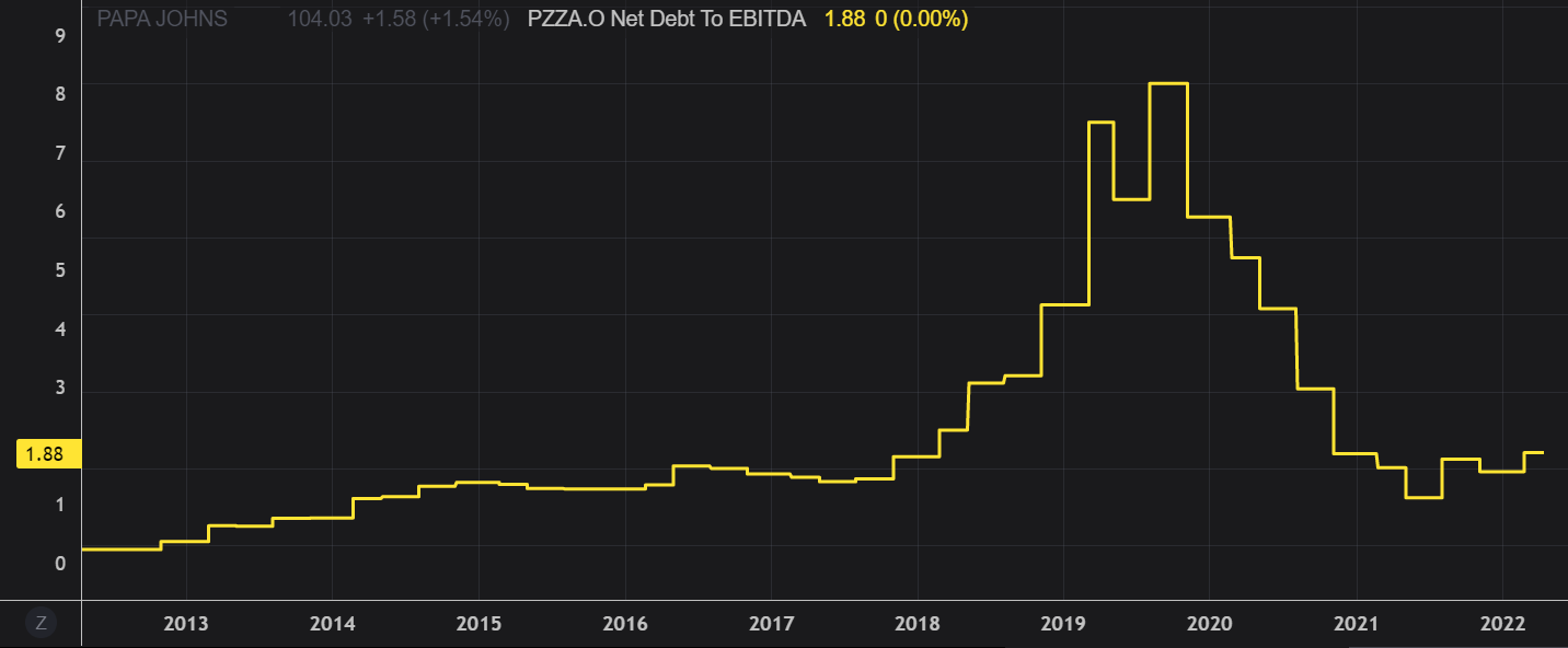 At the same time, net debt skyrocketed from less than $60 million in FY12 to over $430 million as of Q4 FY21. Most of the borrowed funds were used to expand the business, but also to buy back stock. This definitely adds some risk to the bullish thesis but I’m pretty confident PZZA will be capable of servicing its debt obligations. Over 75% of total debt is issued at a fixed interest and a large part of the remaining portion is hedged through swaps.