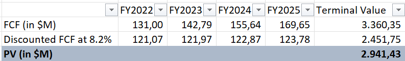Based on 35 million shares outstanding, and a price of $103.4 per share, the company has a market cap of approximately $3.62 billion. In this part, I have used a discounted free cash flow model to value the business. The following assumptions have been made in the model:
