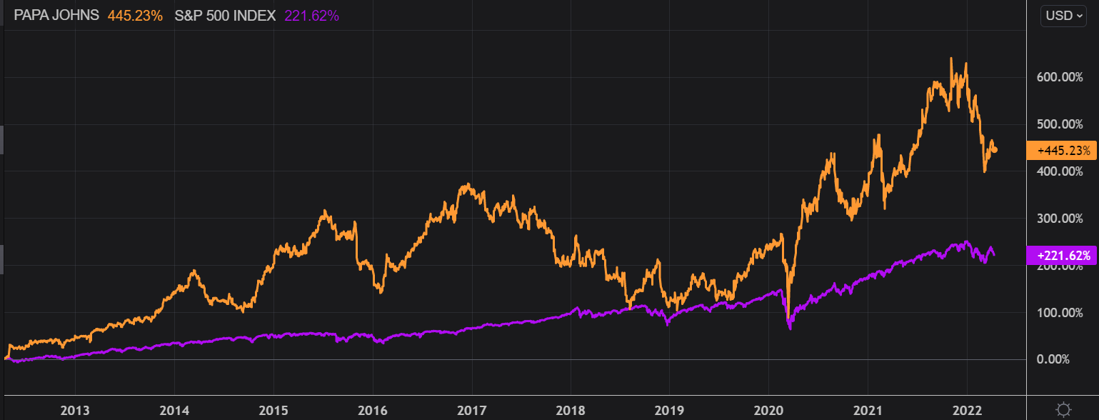 Papa John’s International, Inc. (NASDAQ:PZZA) is one of the winners of the past decade, outperforming the S&P 500 by a whopping ~224 percentage points margin. This company has many of the characteristics of an excellent business, such as a moat, good margins, and an asset-light business model. In terms of valuation, PZZA is currently trading at approximately 32x LTM free cash flow, which makes it expensive for a company likely to grow at a high single-digit rate going forward. I will add this stock to my watchlist and I will be looking to accumulate below $80 per share.