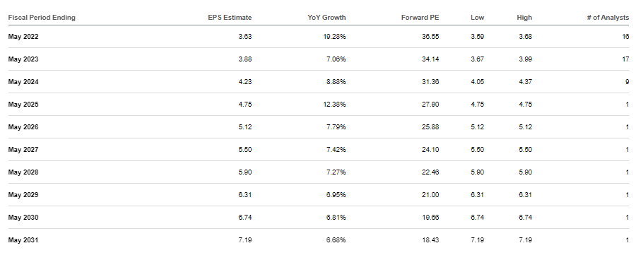 The most recent dividend was $0.66 per share. Based on the latest earnings, this is well covered in terms of EPS as well. If we look at analysts’ expectations again for an EPS of $3.63 for 2022, that would come in at around a 73% payout ratio. They have historically raised their dividend in Q2 of the calendar year. Generally, they announce the raise at the end of April or the beginning of May. So, we won’t have to wait too much longer to see what the new payout might be going forward.