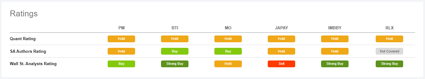 Seeking Alpha does a fine job providing an at-a-glance comparison of PM’s peers, including British American Tobacco (BTI), Altria Group (MO), Japan Tobacco (OTCPK:JAPAY) and Imperial Brands (OTCQX:IMBBY). Here’s a peek at the Quant Ratings, SA Authors Ratings, and Wall Street Ratings: