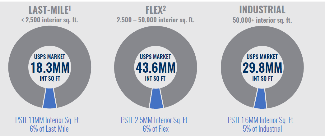 The lack of activity in this sector, nevertheless, is a setback, especially considering the growth potential. Currently, the USPS market in the industrial sector is about +$30M interior square feet. PSTL commands just 5% of that total share.