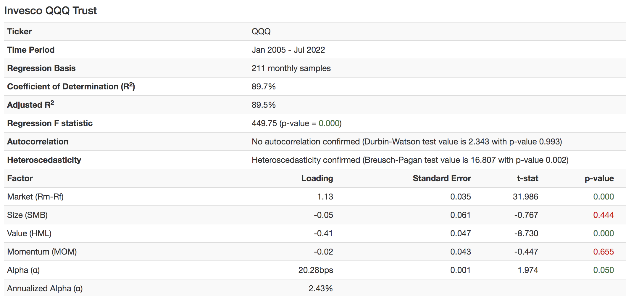 The regression tested the ETF’s performance in four different market environments, namely the general stock market (rm-rf), small-cap versus large-cap performance (SMB), low book value versus high book value (HML), and high momentum versus low momentum (MOM). Collectively I was able to find reasonably reliable results with the model explaining 89.5% of the asset’s historical returns. Additionally, the model detected inconsistent variance (heteroskedasticity) in the return distribution and corrected it by applying the Breusch-Pagan test.