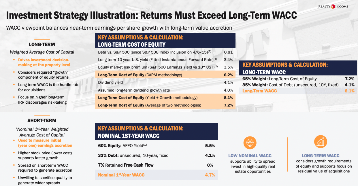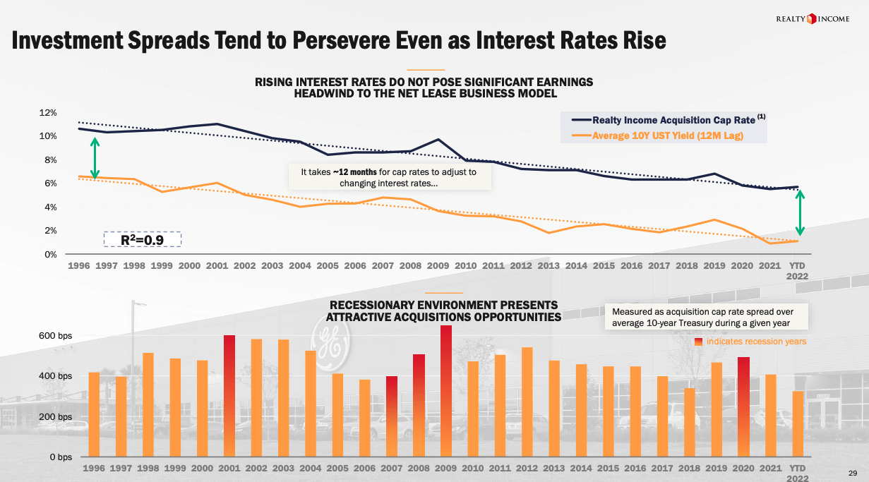 Rising costs require O to purchase properties with higher cap rates to maintain the spread, which can steer the company into risky assets. However, we do not see indications of this happening. A recessionary environment could present attractive investment opportunities for a well-capitalized enterprise.