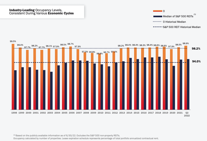 Occupancy rates continue to be high. Rent escalation clauses pegged to inflation are starting to kick in, but tenants are resilient thus far. O’s solid tenant base should withstand even higher costs as they can carry it over to customers. We will simulate slower growth levels in all our scenarios to account for a potentially lower occupancy rate.