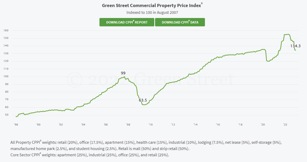Just looking at the charts above, it would certainly appear to be the case that commercial real estate and REIT prices are slumping in a state of despondence, which likely means that market values are trading below their long-term fair values.