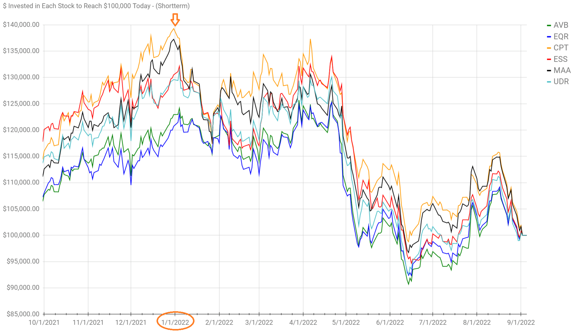 What I find interesting is that despite CPT competing for the largest increase in guidance, it also has the largest decline year-to-date as seen in the $100k chart: