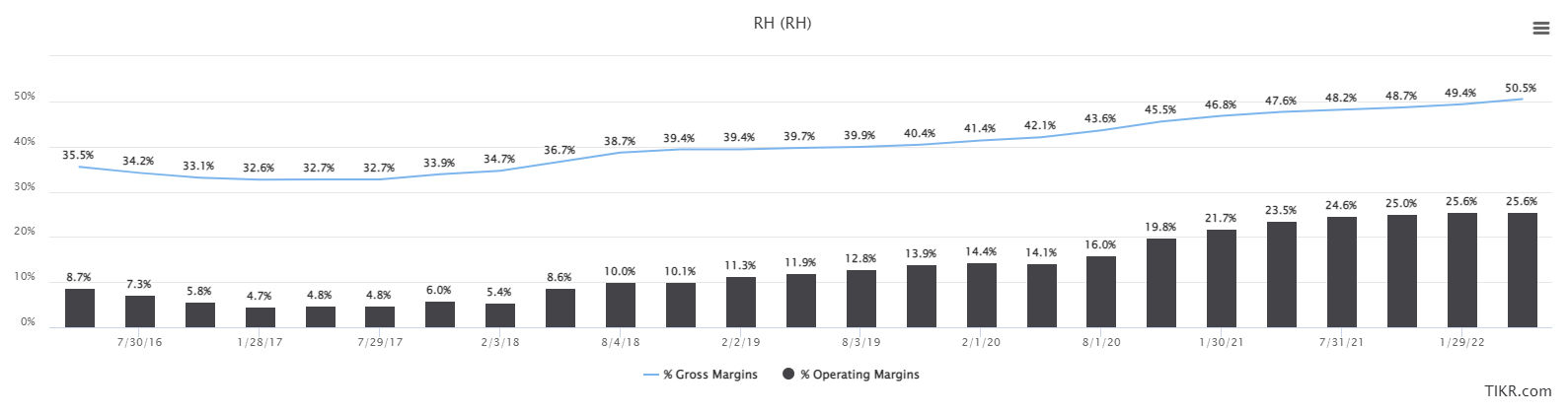 This is a trailing-twelve-months look at gross margins and operating margins, which is one of the best stories in retail, in my view. I mentioned a few years ago RH reinvented itself, and this is the result. The company focuses now on high-margin, sustainable businesses, and rids itself of everything else. Operating margins are in the low- to mid-20s, which is tremendously high for a furniture company. Gross margins continue to rise, and the company is leveraging down fixed costs, resulting in larger and larger black bars on the chart above.