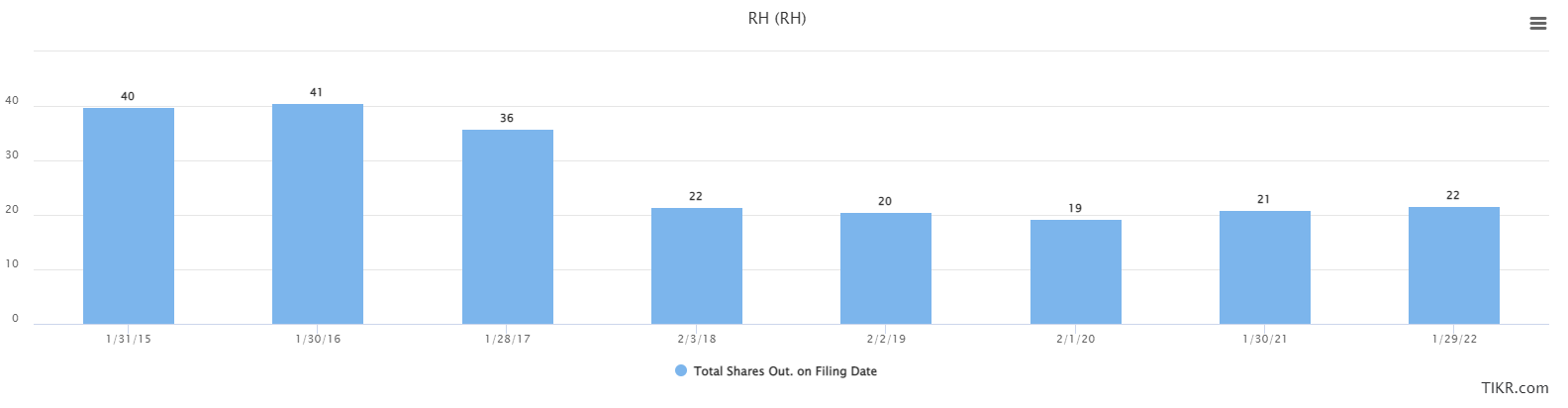 RH has repurchased shares in the past, but unlike more mature companies that buy back some each quarter or each year, RH does big bang repurchases all at once. We can see fiscal 2018 was such a period, with the share count declining by about 40%, before the share count gradually moved higher to ~25 million shares as of the end of the most recent quarter.