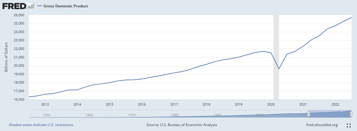 As we can see here, the M3 money supply has increased from $10.2008 trillion ten years ago to $21.5034 trillion today. This is a 110.80% increase over the period. Here is how the gross domestic product has evolved over the same period: